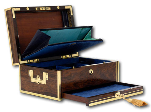 Dating to around 1828, this antique jewelry & letters box was manufactured and retailed by one of London's finest box makers, David Edwards, whose clientele included the King and other members of the Royal family. It is veneered in finely figured Rosewood, edged in brass, finished with recessed brass bale handles and a sumptuous cushioned and velvet-lined interior.