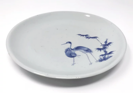A Splendid Blue and White Arita porcelain dish boldly painted with a Crane and Turtle (Tsuru Kame), representative of Friendship, Devotion & Longevity
